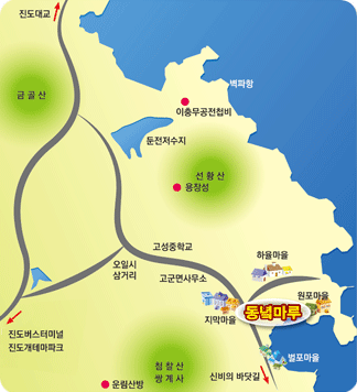 진도대교 → 금골교차로(5.1km) 고군방면 좌회전 → 오일시삼거리(4.6km) 신비의 바닷길, 금갑·고군 방면 좌회전 → 고성삼거리(0.7km) 금갑·고군 방면 좌회전 → 지막삼거리(3.2km) 직진(0.5km) 후 좌회전 → 동녘마루 체험관 도착